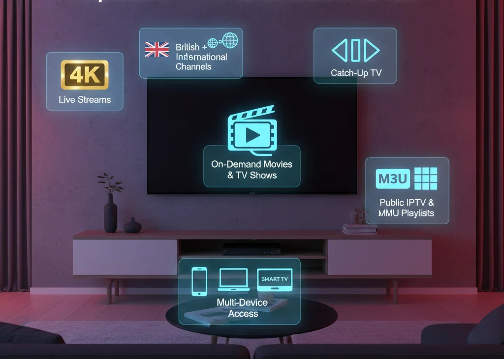IPTV in the United Kingdom refers to services that provide live television and video-on-demand over an internet connection. Unlike traditional cable or satellite TV, IPTV streams content through IP networks, allowing for flexible viewing on multiple devices such as Smart TVs, Firesticks, computers, and mobile devices.